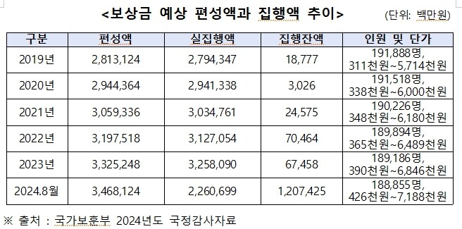 이‧전용액도 ▲6.25 자녀수당 493억7700만원 ▲보훈병원 진료비 348억800만원 ▲위탁병원 진료비 137억7300만원 ▲참전명예수당 86억4000만원 ▲제대군인전직지원금 81억9800만원 ▲제대군인의료지원비 12억8400만원 ▲재해보상금 12억7400만원 ▲무공영예수당 2억8200만원 ▲영주귀국정착금 2억1800만원 ▲사망일시금 3993만원 ▲4.19혁명공로수당 3700만원 등으로 나타났다.