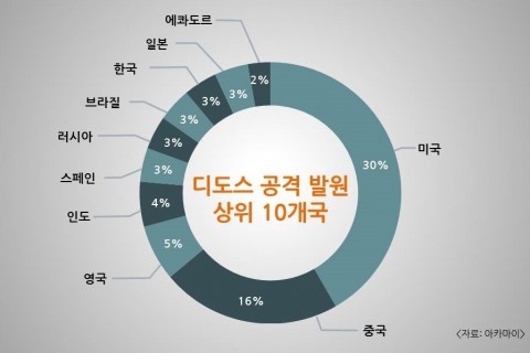 | 디도스 공격 발원 상위 10개국(소스 IP 개수 기준) |