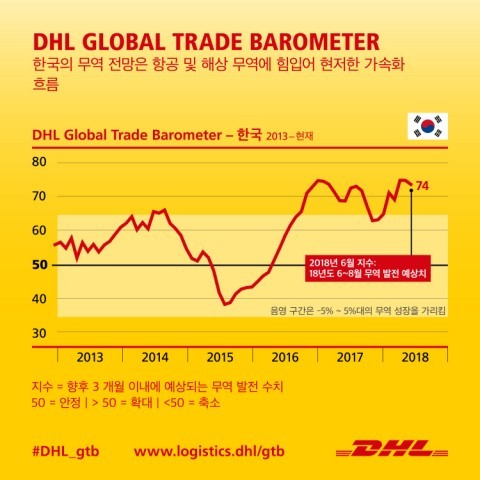 DHL이 발표한 DHL Global Trade Barometer의 데이터에 따르면 한국의 무역 성장세가 크게 확대될 것으로 전망되었다. 한국의 전체 무역 지수는 전 분기 69포인트에서 이번에 74포인트로 5포인트 상승했다.