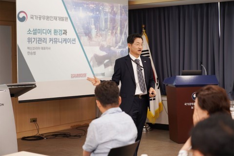 | 경기 과천 국가공무원인재개발원에서 제5기 미디어커뮤니케이션과정 5급 이상 공무원을 대상으로 기업위기관리 전문기업 맥신코리아 한승범 대표가 소셜미디어 환경과 위기관리 커뮤니케이션을 주제로 강연하고 있다 |