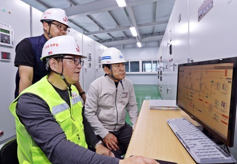 | 12일 SK텔레콤과 현대자동차 관계자가 현대자동차 울산공장에 구축한 열병합발전 시스템 및 FEMS 솔루션을 점검하고 있다 |