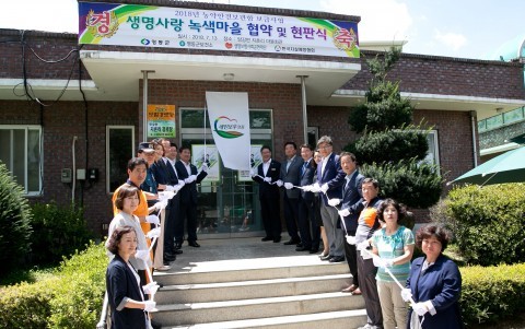 | 생명보험사회공헌재단이 생명사랑 녹색마을 현판식을 가졌다(왼쪽 7번째부터 정성엽 충북도청 보건복지국장, 윤석진 영동군의장, 박세복 영동군수, 박병진 충북도의원, 조경연 생명보험재단 상임이사 |