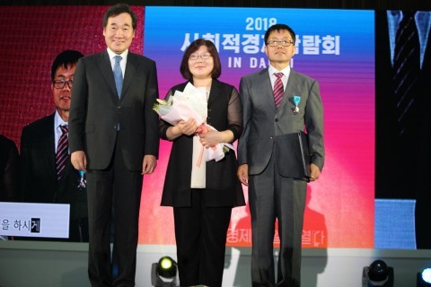 | 7월 14일 대구 엑스코에서 열린 2018 사회적경제 박람회에서 이낙연 국무총리가 산업포장을 수여했다. 산업포장을 수상한 안산의료복지사회적협동조합 경창수 이사장 (오른쪽) |