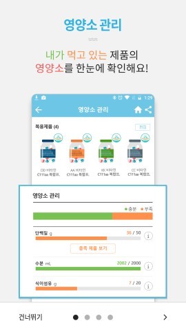 이로써 기존에 각 제품의 원료 등에 대한 정보를 제한적으로 제공했던 것을 개선해 제품별로 어떤 영양소가 포함돼있는지 사용자가 한눈에 알아볼 수 있게 한 것은 물론, 각 영양소 함량을 자동 계산하여 한국인 권장 섭취량과 대비해 사용자가 적절하게 건강기능식품을 섭취하고 있는지 확인할 수 있도록 했다.