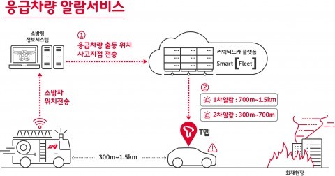 소방청 정보시스템이 응급차량 위치와 사고 지점을 SK텔레콤 커넥티드카 플랫폼 스마트 플릿(Smart [Fleet]) 서버로 전송하면 스마트 플릿은 응급차량의 최적 경로를 분석한다. 이어 응급차가 주행할 가능성이 높은 도로에서 T맵을 켜고 운행 중인 차량에 알람을 전달한다.