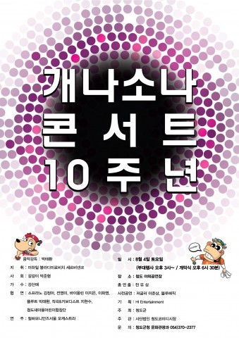 언제나 신선한 아이디어로 화제를 모으는 개그맨 전유성이 8월 4일(토) 저녁 7시부터 경북 청도군 야외공연장에서 ‘반려견을 위한 음악회-개나소나 콘서트’ 10주년 공연을 연다.