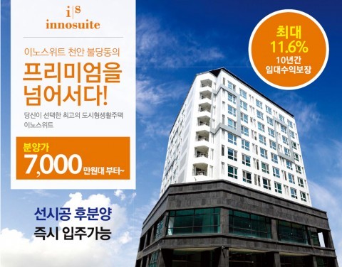 ‘이노스위트’가 위치한 천안 불당동은 중심상업지역으로, 천안의 강남으로 불릴 만큼 매월 유동인구 3만여명에, 200여개의 음식점, 100여개의 기업체 및 50여개의 학원, 병원, 유흥주점 및 업무상업시설 등이 꽉 차 있어 천안의 젊은 직장인들이 가장 많이 모이는 핫플레이스이다. 주 타겟층인 20~30대의 유동인구가 많아 오피스텔이나 도시형생활주택 등 수익형 부동산의 임대수익률이 좋아 근교 타지역에 비해서도 분양인기가 좋다.
