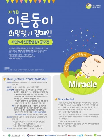 접수 기간은 8월 6일(월)부터 10월 7일(일)까지며, 사연과 사진(동영상) 공모전 1등(각 1명)에게는 100만원씩, 2등(각 2명)에게는 30만원씩, 입선(각 5명)에게는 3만원 상당의 상품이 수여된다. 또 모든 입상자는 시상식을 포함한 다양한 프로그램으로 구성된 이른둥이 희망찾기 캠페인 ‘Miracle Festival’ (11월 11일)에 초청될 예정이다. 보다 자세한 내용은 홈페이지, 페이스북 또는 캠페인 사무국(02-518-8678)을 통해 확인 가능하다.