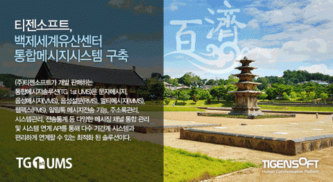 통합메시지 전송 솔루션 및 멀티미디어 동영상 전문기업 ㈜티젠소프트(대표 고훈호)가 백제세계유산센터 ‘백제역사유적지구 통합방범시스템 구축’ 프로젝트에 통합메시지시스템(TG 1st UMS)을 성공적으로 구축했다고 밝혔다.