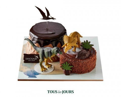 뚜레쥬르 ‘공룡 케이크’는 화산섬에 살고 있는 공룡들의 모습을 형상화했다. 공룡 시대를 그린 케이크 받침 위에 화산섬 모양의 달콤한 초코 케이크와 오레오 쿠키를 넣어 진한 맛의 초코&쿠키크림 케이크를 배치해 두 가지 맛을 즐길 수 있게 구성했다. 그 위에 어린이들이 가장 좋아하는 공룡 ‘티라노사우르스’와 ‘트리케라톱스’ 피규어를 올려 생동감 있게 표현했다. 입체 케이크 받침과 피규어는 놀이용으로 활용할 수 있는 것이 특징이다. 공룡 일러스트로 디자인한 ‘다이노 월드’ 전용 패키지를 적용해 선물용으로도 매력만점이다.