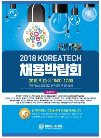 코리아텍(한국기술교육대, 총장 김기영)이 9월 12일(수) 충남 천안시 병천면 코리아텍 담헌실학관 광장과 1층 로비에서 삼성전자(주) 등 대기업, 중견·중소기업, 외국계기업 등 35곳과 재학생 및 졸업생 1900여명이 참가한 가운데 ‘2018 코리아텍 채용박람회’를 오전 10시~오후 5시까지 개최한다.