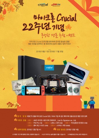 마이크론 크루셜 SSD의 공식 한국 유통사인 대원CTS는 시장 확대와 더불어, 이를 가능케 할 수 있었던 마이크론 제품군에 대한 관심을 주신 사용자의 응원과 성원에 보답하기 위하여 특별한 22주년 프로모션을 진행한다며, 22년간 마이크론에 대한 지속적인 관심을 주신 모든 분들이 프로모션에 참여하여 행운을 거머쥘 수 있기를 바란다고 밝혔다.