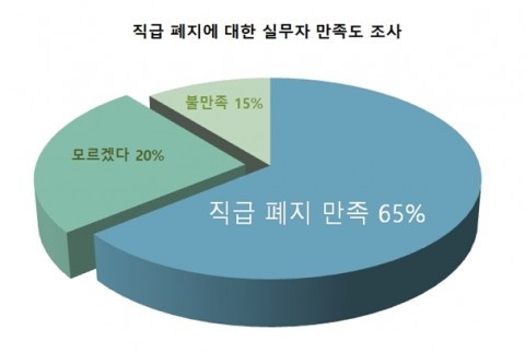 직급 폐지 만족도 조사에 따르면 기업의 직급 폐지 정책에 대해서 만족한다는 답이 전체의 65%를 차지했고, 잘 모르겠다는 답이 20%를 차지, 직급체제 폐지에 반대하며 직급제도를 유지해야 한다는 답이 15%를 차지했다.