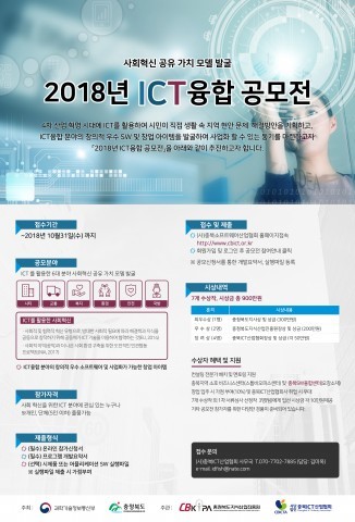 충북지식산업진흥원과 (사)충북ICT산업협회(회장 김동호, 이하 협회)가 공동으로 4차 산업혁명시대에 ICT를 활용하여 시민이 직접 생활 속 지역 현안 문제 해결방안을 기획하고 ICT융합 분양의 창의적 우수 SW 및 창업 아이템을 발굴하여 사업화할 수 있는 동기를 마련하고자 ‘2018년 ICT융합 공모전’을 개최한다.