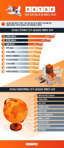 원스톱 여행 솔루션 카약은 지난해에 이어 올해에도 ‘지금 당장 떠나야 할 여행지(Better-now-than-later)’ 리포트를 발간, 사용자 검색 데이터 분석을 통해 전년 대비 검색 증가율 기준 2018년 인기 급상승 여행지 10곳을 발표했다.