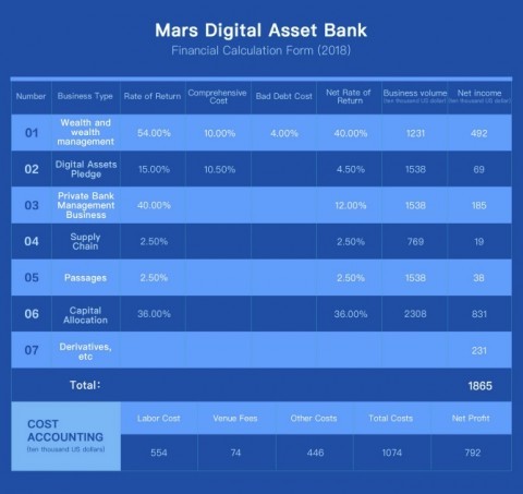 마스 디지털 자산은행(Mars Digital Asset Bank)은 바로 이 같은 업계의 고충을 해결하기 위해 디지털 자산 금융솔루션을 출범했다. 상품믹스의 다각화를 비롯해 완전한 체인레이아웃과 콸리티 서비스 플랫폼, 전문 디지털자산 운용팀 등을 통해 사용자의 투자 필요사항을 충족시켜 주게 된다. 마스 디지털은 올해 말까지 디지털 자산 금융서비스 분야의 선두주자로 부상할 것으로 전망된다. 등록 사용자 규모는 30만명을 상회하는 한편 기업규모는 최대 15억달러를 형성해 순익이 792만달러(미화 기준), 자산가치 추정액은 1억1873만달러(미화 기준)로 전망된다.