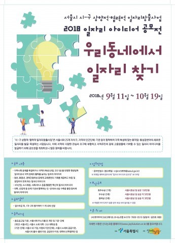 서울시와 25개 자치구가 함께 진행하는 ‘2018년 일자리 아이디어 공모전 : 우리동네에서 일자리 찾기’는 2017년 하반기부터 추진하고 있는 ‘시-구 상향적·협력적 일자리창출사업’의 일환으로 서울시민 또는 서울시 소재 법인·단체면 누구나 참여 가능하다.
