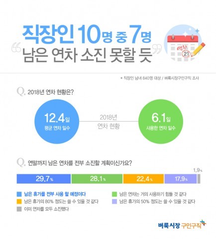 | 미디어윌이 운영하는 벼룩시장구인구직이 직장인 840명을 대상으로 직장인 연차 사용 실태를 설문 조사한 결과 68.4%가 올해 남은 연차를 다 소진 하지 못할 거 같다고 답했다 |