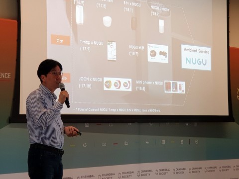 13일(현지시간) 미국 시애틀에서 열린 한인 IT 전문가 단체인 창발(창의와 발전)에서 개최한 컨퍼런스에서 김윤 SK텔레콤 센터장이 자사의 AI 연구 분야 등에 대해 설명하고 있다