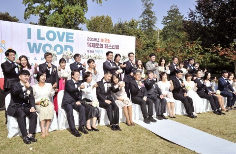 | 용산가족공원에서 펼쳐진 제2회 목재문화 페스티벌에서 제6회 목혼식에 참여한 부부들이 기념촬영을 하고 있다 |