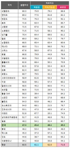 한국의 연금제도는 47.3(D)점을 받아 34개국 중 30위를 차지했다. 총점은 작년 47.1(D)과 비슷하지만, 작년 대비(25위) 5계단 하락했다. 순위 하락의 이유는 홍콩, 페루, 사우디아라비아, 스페인 등 4개국의 신규 지수의 편입과 일본의 4계단 상승 때문이다. D를 받은 국가의 연금제도는 바람직한 측면도 있으나 일부 주요한 약점이나 부족한 점이 있어 개선하지 않을 경우 효율성이나 지속성이 위협받을 수 있다.