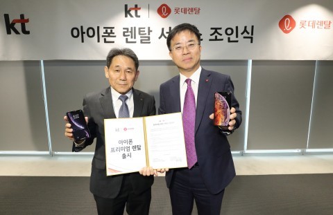 KT(회장 황창규)가 서울시 종로구 KT광화문빌딩 East에서 롯데렌탈과 ‘아이폰 렌탈 서비스’ 출시를 위한 공식 협정을 체결했다고 24일 밝혔다. 이날 행사에는 KT 마케팅부문장 이필재 부사장과 롯데렌탈 표현명 사장이 참석했다.
