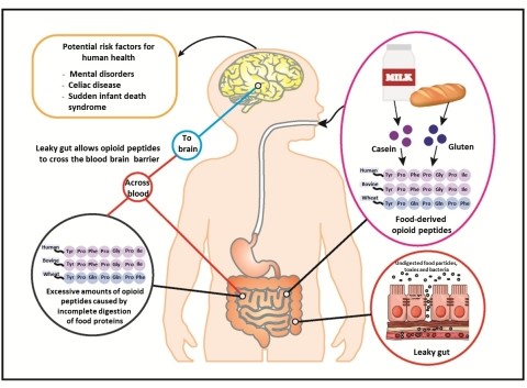 오피오이드 펩타이드는 뇌에 있는 오피오이드 수용체와 결합하는 펩타이드로서 신경전달물질을 분비하는데 영향을 미칠 수 있다. 일부 오피오이드 펩타이드는 인체 내에서 만들어지지만 많은 경우 음식물을 통해 섭취된다. 우유와 곡물에 포함되어 있는 단백질이 불완전하게 소화될 경우 음식물을 통한 오피오이드 펩타이드가 장내에 축적되게 된다. 건강한 사람들의 경우 이러한 펩타이드는 효소를 통해 가수분해(또는 분해) 됨으로써 아무런 악영향을 끼치지 않는다. 그러나 장내 불균형(세균총의 문제)이 있거나 장누수증후군이 있는 사람들의 경우 오피오이드 펩타이드는 장과 혈관-뇌 장벽을 뚫고 심각한 경우는 오피오이드 및 중추신경계에까지 영향을 미칠 수 있다(그림 1 참조). 장이 민감한 사람들의 경우 음식물을 통한 오피오이드 펩타이드가 정신질환(Sokolov et al., 2014)과 복강질병(celiac disease) (Hardy and Tye-Din, 2016, Kumar et al., 2017) 등 심각한 질병을 초래할 수 있다는 증거가 많이 보고된 바 있다.