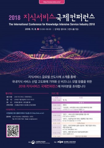 산업통상자원부가 주최하고 정보통신산업진흥원에서 주관하는 ‘2018 지식 서비스 국제 컨퍼런스’가 11월 8일 관계부처와 민·관 전문가, 산업관계자가 참석한 가운데 서울 양재동 엘타워에서 개막한다.
