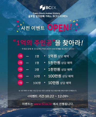 BCEX코리아 사전 예약 이벤트는 이벤트 페이지에 접속해 사전 가입 예약 신청을 하면 응모할 수 있다. BCEX코리아는 향후 추첨을 통해 1등 1명 1억원, 2등 1명 5000만원, 3등 3명 1000만원, 4등 10명 100만원, 5등 10만원 등 총 115명에게 2억원 상당의 암호화폐를 제공할 계획이다.
