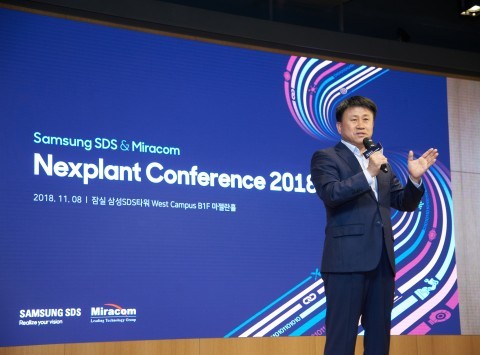 | 잠실 삼성SDS타워에서 개최된 넥스플랜트 Conference 2018행사에서 삼성SDS 스마트팩토리사업부장 이재철 전무가 인사말을 하고 있다 |