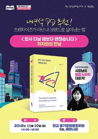 | 경기콘텐츠진흥원 판교경기문화창조허브가 개최하는 회사 다닐 때보다 괜찮습니다 저자와의 북콘서트 포스터 |