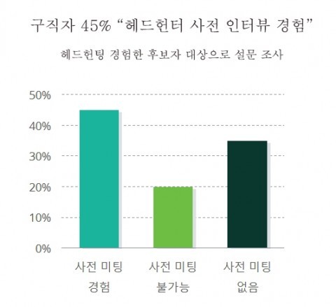 ‘헤드헌터와 사전 인터뷰 경험’에 대한 조사에 따르면 실제로 헤드헌터와 직접 만나서 사전 인터뷰를 진행했다는 답이 전체의 45%를 차지했고, 헤드헌터가 후보자에게 사전 인터뷰를 요청하지 않았다는 답이 전체의 35%를 차지, 사전 인터뷰를 요청했으나 후보자의 사정으로 사전 인터뷰가 불가능했다는 답은 전체의 20%를 차지했다.