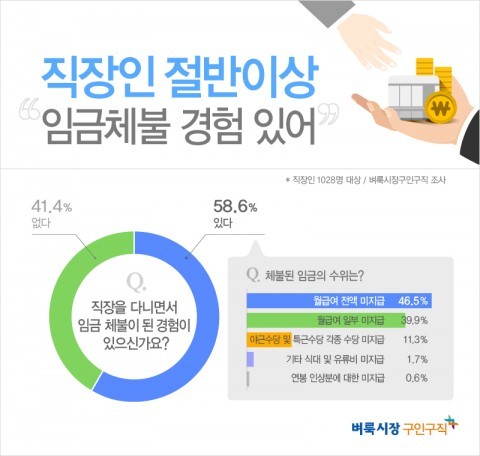 | 벼룩시장구인구직이 직장인 1028명을 대상으로 설문 조사한 결과 응답자의 58.6%가 임금체불 경험이 있다고 답했다. 또한 이 중 15.9%는 현재도 임금체불 중이다고 답했다 |