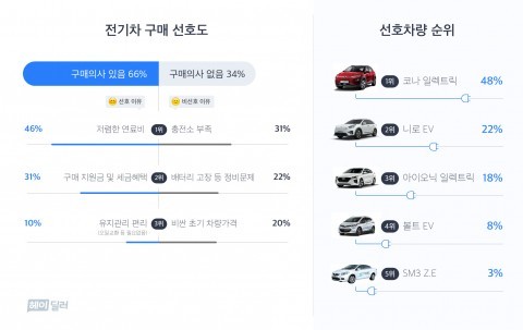 21일 헤이딜러 조사결과에 따르면 전체 응답자 가운데 66%가 다음 차량을 구매할 때 전기차를 구매하겠다고 응답했고, 반대로 34%의 응답자는 전기차 구매를 고려하지 않고 있다고 밝혔다.