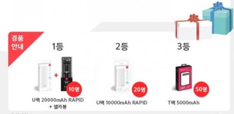 기간은 11월 23일~12월 2일까지 진행되며, 당첨자는 12월 3일에 발표된다. 이벤트 경품은 총 80명에게 제공되며 상세 경품 내용은 1등 U팩 20000mAh RAPID (화이트) + 셀카봉(블랙) 10명, 2등 U팩 10000mAh RAPID(화이트) 20명, 3등 T팩 5000mAh(화이트) 50명이다.
