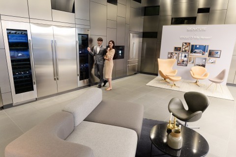 시그니처 키친 스위트의 △48인치 컬럼 냉장고 △24인치 와인셀러 △스팀오븐과 스피드오븐 △듀얼 와이드존 인덕션 등이 주방 공간을, 프리츠 한센의 대표 작품 가운데 △건축가 ‘아르네 야콥센’의 에그 체어, 스완 체어, 드롭 체어 △디자이너 ‘하이메 아욘’의 로소파 △일본 디자인스튜디오와 협업해 만든 ‘넨도 N01 체어’ 등이 거실과 주방을 연출했다.