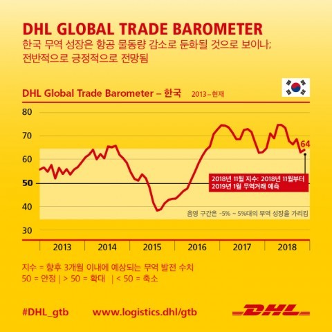 한국의 무역 성장세는 무역 지수가 지난 분기보다 5포인트 하락했음에도 불구하고 상대적으로 꾸준함을 유지하고 있으며 전망 역시 밝은 것으로 관측되었다. 글로벌 물류 선도기업인 DHL이 발표한 DHL Global Trade Barometer 데이터에 따르면 1월에 끝나는 다음 분기 한국의 전체 무역 지수는 64포인트로 아시아 지역 조사 국가 4곳 가운데 인도 다음으로 높았다.