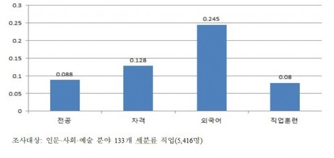 한국직업능력개발원(원장 나영선)은 인문사회예술분야 재직자를 대상으로 조사한 결과, 입직단계에서 외국어 중요성이 전공이나 자격보다 소득에 미치는 상대적인 영향이 매우 커 대학생이 전공 공부보다 외국어에 몰두하는 현상이 합리적일 수 있음을 보였다고 4일 밝혔다.