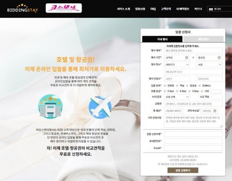 비딩스테이가 운영하는 호텔·항공권 입찰 중개플랫폼 ‘비딩스테이’는 기업·단체·개인이 호텔의 단체 객실이나 연회장·항공권·전세버스가 필요할 경우 온라인 입찰을 통해 편리하게, 그리고 최저가로 이용할 수 있는 온라인 입찰 플랫폼이다.
