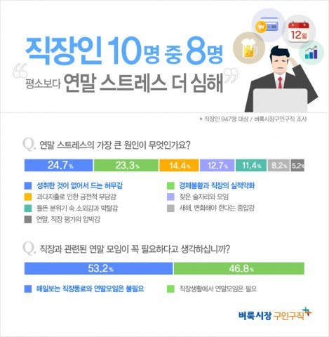 | 벼룩시장구인구직이 직장인 947명을 대상으로 직장인 연말 스트레스에 대해 설문 조사한 결과 83.5%가 연말 평소보다 더 스트레스를 받는다고 답했다 |