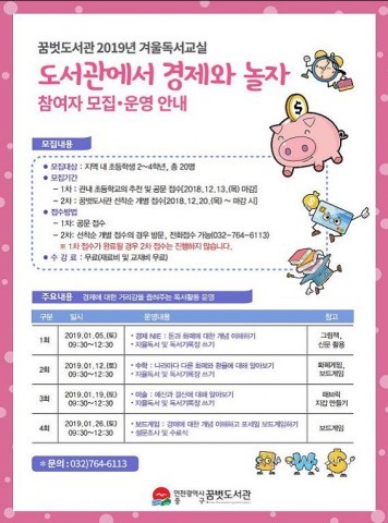 인천광역시 중구청이 설립하고 인천광역시도서관발전진흥원이 운영하는 꿈벗도서관(관장 김태경)이 겨울방학을 맞이한 어린이들이 경제 개념과 상식을 익힐 수 있도록 겨울 독서교실을 운영한다.