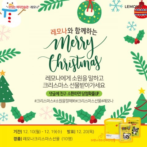 추첨을 통해 레모나가 준비한 크리스마스 선물인 ‘레모나산60포’와 간편하게 씹어먹는 비타민 ‘레모나헬씨정’, 어린이 비타민 ‘레모나키튼정’을 총 10명에게 선물로 증정한다.
