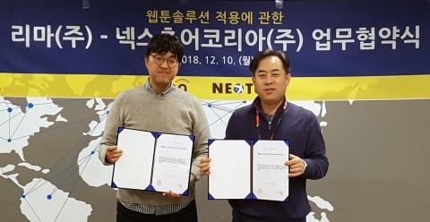 보안 솔루션 기업 리마주식회사가 12일 넥스츄어코리아㈜가 운영하는 웹툰 플랫폼 ‘스푼코믹스’에 자사 ‘락툰(LockToon)’ 서비스 계약을 체결했다고 밝혔다.