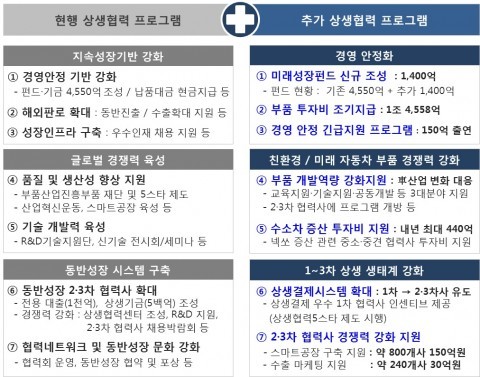 그 동안 현대차그룹은 △2002년 자동차부품산업진흥재단 설립 △2006년 전담 조직인 상생협력추진팀 구성 △2011년 R&D기술지원단 신설 △2012년 협력사 채용박람회 개최 △설·추석 등 매 명절 때마다 협력사 대금 조기지급 △청년 일자리 창출과 협력사 우수 인재 확보를 지원하는 ‘고용 디딤돌 프로그램’ 운영 등 다양한 활동을 진행하며 협력사와의 동반성장에 매진해 왔다.