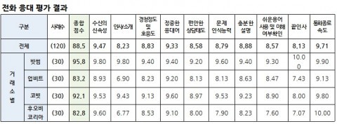 거래소별 종합평가에서 빗썸은 95점, 코빗은 92점, 업비트는 83점, 후오비코리아는 82점을 받아 4개 거래소의 전화응대 서비스 평균 점수는 88점으로 비교적 잘하고 있는 것으로 볼 수 있다.