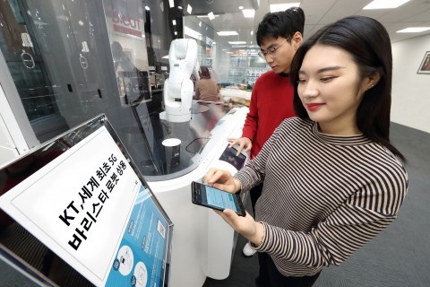 KT(회장 황창규)는 서울 서초구 삼성생명 사옥에 있는 무인 로봇카페 ‘비트’에 5G 네트워크를 적용했다고 25일 밝혔다. 비트(B;eat)는 커피 전문 브랜드 달콤커피의 로봇 카페로 바리스타 로봇이 주문을 받고 커피를 제조한다.