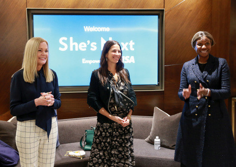 비자가 지원하는 여성 소유 중소기업을 옹호하기 위한 글로벌 이니셔티브를 발표했다. 비자의 임원 메리 앤 라일리(좌)와 수잔 커리어(우)가 여성창업자공동체 주최로 뉴욕시 허드슨 야드에서 개최된 행사에서 창립자 레베카 밍코프(가운데)와 함께 했다