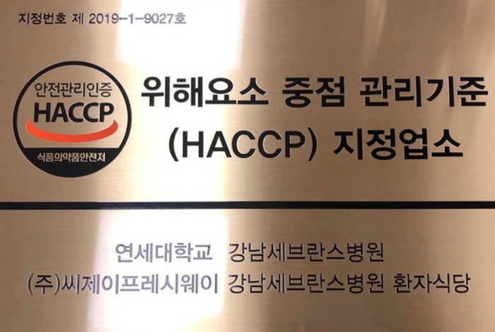 CJ그룹의 식자재 유통 및 단체급식 전문기업 CJ프레시웨이(대표이사 문종석)가 운영하는 강남세브란스병원(병원장 윤동섭)의 병원급식 점포가 한국식품안전관리인증원으로부터 HACCP 지정을 받았다고 지난 27일 밝혔다.