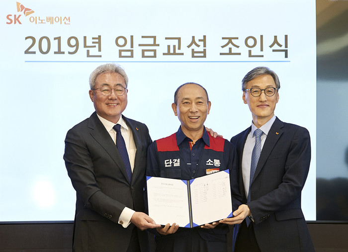 SK이노베이션(대표이사 사장: 김준)은 5일, 김준 SK이노베이션 총괄사장, 조경목 SK에너지 사장, 이정묵 노동조합위원장 등이 참석한 가운데 서울 종로구 서린동에 위치한 SK빌딩에서 ‘1.5%인상에 합의하는 2019년 임금협상’ 조인식을 가졌다고 밝혔다.
