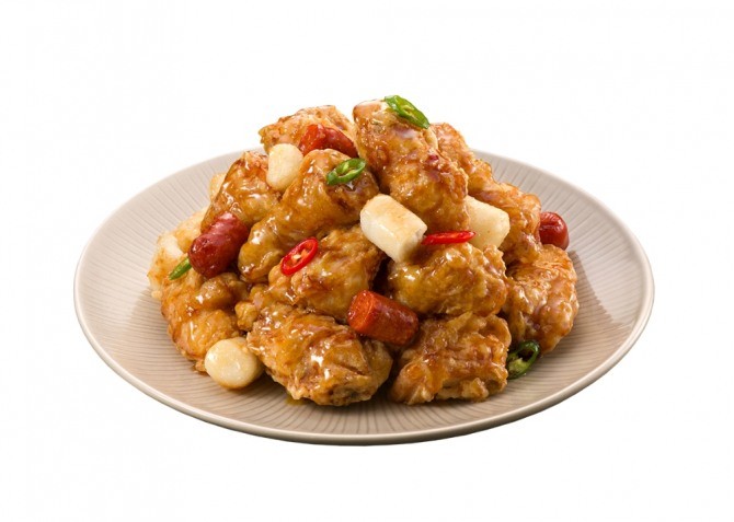 ‘소떡강정’은 바삭하게 튀겨낸 치킨에 쫀득한 쌀떡과 육즙 가득한 소시지를 달콤한 조청 소스로 버무린 강정치킨이다.